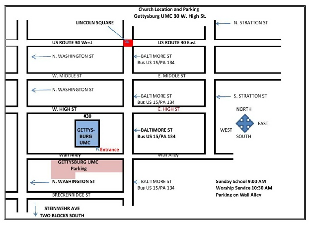 Gettysburg United Methodist Church fronts on West High Street. Church parking and the main entrance is directly behind the Church Building.